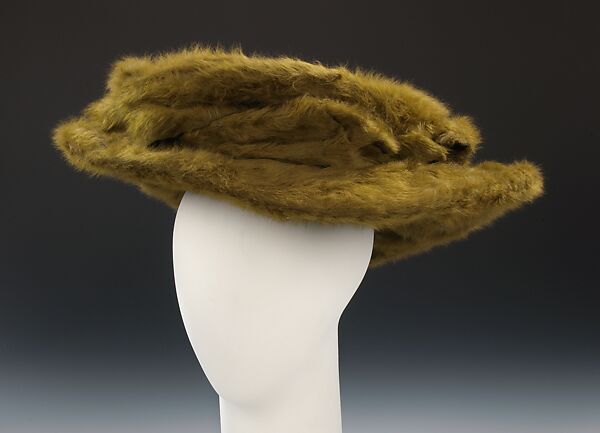 The increasing importance of shape over ornamentation in millinery design is seen in this extraordinary creation. The size, bulky material, draped construction, and undulating asymmetric shape integrate to give a strong sense of sculptural presence. The impressive proportions - the diameter of crown is a full 10 inches - epitomize the taste for bulky, oversized hats at its high point around 1910. Fashionable sensibilities would very soon swing to favor smaller and lighter styles.