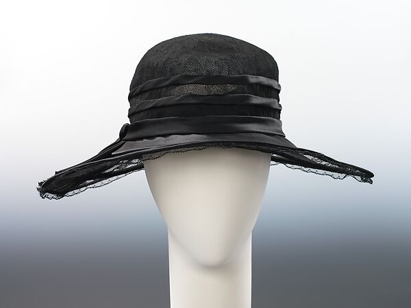 Amelia Beard Hollenback (1877-1869) was the daughter of prominent financier and philanthropist John Welles Hollenback (1835-1927). This stylish 1922 cloche features the wide brim popular throughout the 1920s. The design features an interesting play of textures and light in the use of both delicate and heavy materials, especially the sheer brim and veiled and satin-wrapped crown.
