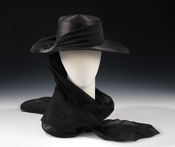 This beautiful and stylish mourning hat from the World War I era was purchased from Henri Bendel, an important maker and importer of luxury goods. Its clean lines and elegant swath of scarf retain their sense of chic today. The single large buckle trim, a popular feature at time, has the weight and presence necessary to stand up to the severe color scheme and contrasting textures. Despite the timeless beauty of its design, this hat would have had a very limited wearability: the fabric of the scarf, a variety of crimped black crepe called "mourning crepe", was used exclusively for mourning.