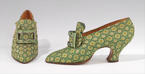 Pietro Yantorny (1874-1936), the self-proclaimed "most expensive shoemaker in the world", was a consummate craftsman utterly devoted to the art of shoemaking. Yantorny sought to create the most perfectly crafted shoes possible for a select and exclusive clientele of the most perfectly dressed people. While Yantorny's shoes are best know from the surviving examples created for Lydia de Acosta Lydig (1880-1929) in her favored antique velvets and laces, this pair of colonial pumps shows a refreshingly different aspect of the designer's work in the boldly colored and patterned fabric. Yantorny's signature is preserved, however, in the elegant silhouette and distinctive curve of the instep, perfectly harmonized trim, and immaculate craftsmanship.