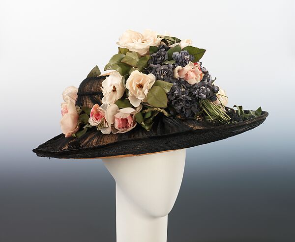 Oversized hats of the years around 1910 were the perfect stage for opulent display of large and exquisite flowers, and the naturalism and delicacy of the flowers on this elegant hat is particularly notable. By the early 20th c., the manufacture of artificial flowers was a large and highly specialized trade, employing some 25,000 workers in more than 2,000 establishments in Paris alone. The firms were grouped geographically by their specialty (blossoms of various quality, leaves, clusters, blossom-and-leaf assemblers, and so on) and the manufacture divided between "natural" and "fantasy" flowers. Moreover, within each firm, each worker specialized in a particular type of flower. The rose was the most popular and prestigious flower, and rose makers were the most skilled and highest paid in within the company.