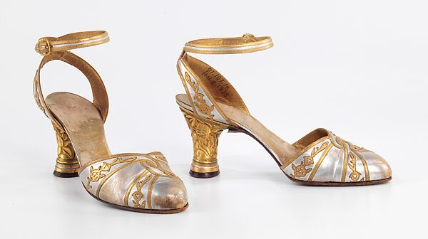 André Perugia's elegant and innovative footwear has earned him a place among the top shoe designers of the 20th century. Perugia collaborated with many of the top couturiers for over sixty years, most notably with Paul Poiret in the 1910s and 1920s, and Elsa Schiaparelli in the 1930s. He was an innovator on all fronts; style, construction technology, and utilization of materials. This pair of evening sandals represents the height of progressive design and craftsmanship for which Perugia was known. No detail escaped the designer’s attention, as seen here in the cast heel and wreath-shaped buckle. It was not usual for evening shoes to have open backs until the mid 1930s, so this daringly bare design is extremely advanced, even shocking, for the period.