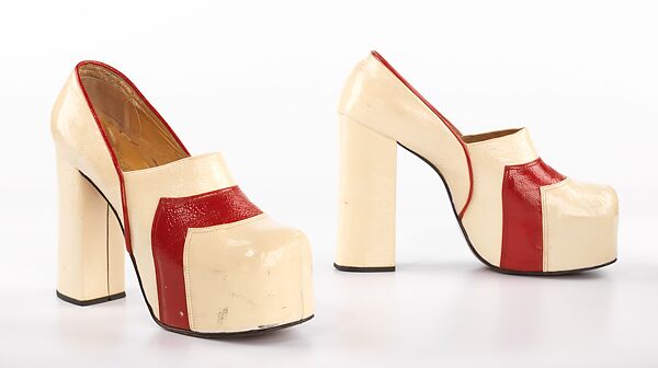 The historicizing "hippie" or bohemian look of the late 1960s spurred the revival of the platform sole, which had enjoyed wide success in the 1940s. Designers were soon making frankly modern versions of the platform shoe, with exaggerated bulgy toes, flaring heels, and curvaceous soles. Colorful piecing and patchwork was frequently used to add a fresh, graphic quality to the upper. The style seems to have been particularly favored in Latin America, and many of the best examples come from makers in that region. In this example of the extreme platform style, the visual impact is intensified by a blod colorscheme and by treating the upper and sole as a continuous unit.