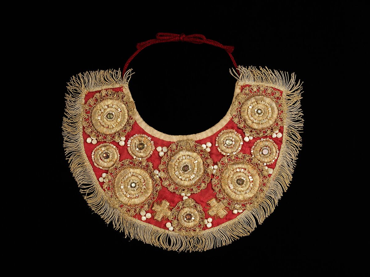 Russian women accessorized their festival ensembles with collars such as this along with cuffs, belts, and jewelry. The use of mother-of pearl and pearl in the embroidery suggests it may have been made in Northern Russia where river pearls were plentiful.