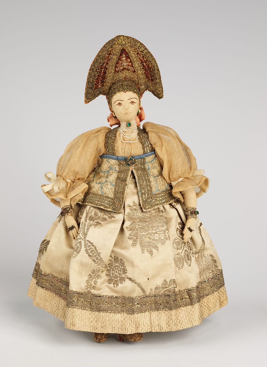 This doll, along with 2009.300.1718 offers a true representation of a traditional costume with all of the details. They are very rare objects, characterizing costumes worn in the northern regions of Russia. The headdress in this example is unique to the Vladimir province, east of Moscow.