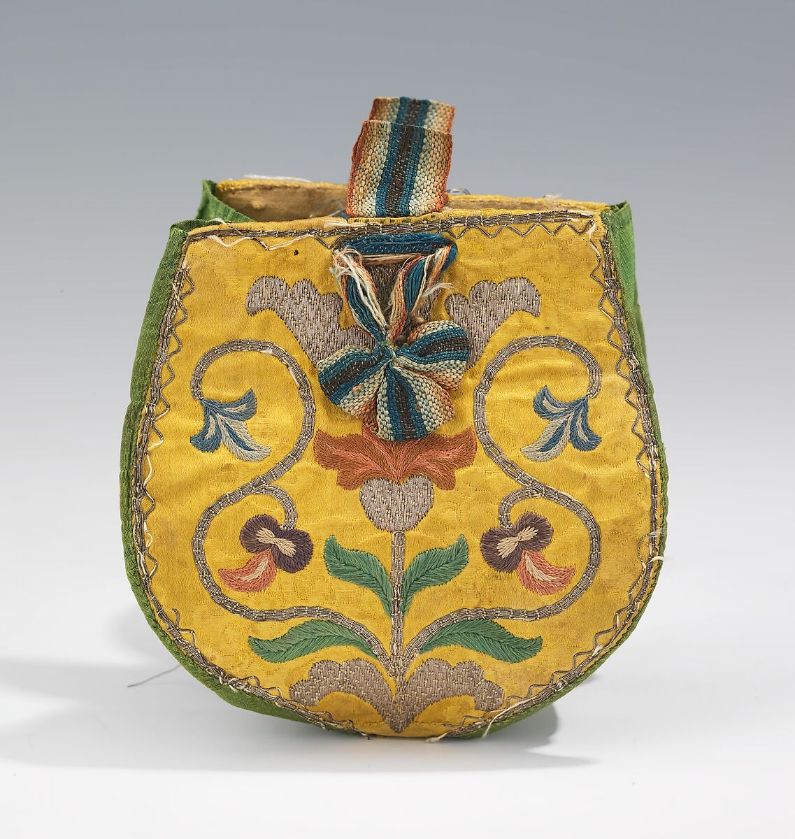 This is a particularly well-preserved object, retaining the original drawstring and loops. The embroidery is characteristic of the quality created in the 18th century and is heightened by the damask surface.