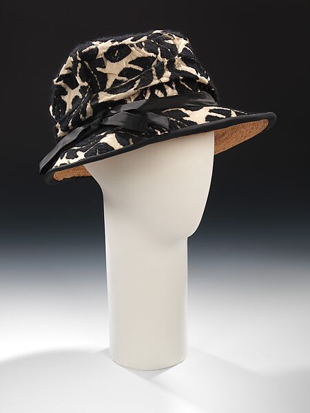 The post-World War I era was a transitional period in fashion, one in which the highly feminized image of the 1910s was making way for the carefree garçonne of the later 1920s. That stylistic transition is expressed in this hat in its bold patterning, contrasting colors and unusual combination of materials. The handsome foliate pattern and wool embroidery are a nod to the heavy stylized floral millinery ornamentation of the 1910s, relieved by the delicate silk ground and straw under brim. James McCutcheon and Company was known primarily as an exclusive retailer of fine linens and women's and children's furnishings.