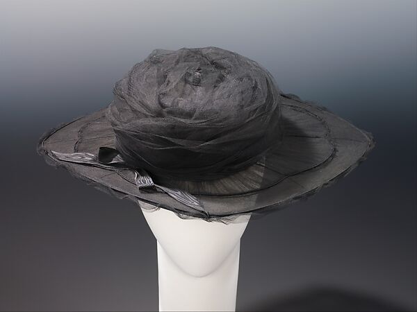 The square frame of this hat is an unusually creative interpretation of the early cloche, which had a high crown; flat top and wide brim, a style that remained popular in the early 1920s for spring and summer wear. The various manipulations of the tulle: densely wrapped around the crown, stretched over the brim and shirred around the edge, all complimented by the moiré ribbon band, attest to the high caliber of design and craftsmanship of Brooklyn-based milliner Elizabeth Rhind.