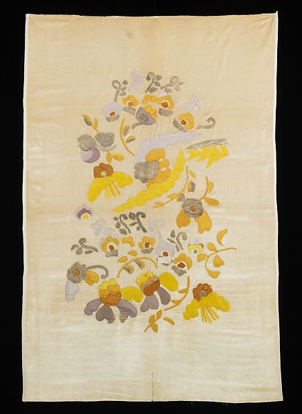 This object is from a collection of sample embroideries, which was originally owned by Morris de Camp Crawford, editor of Women's Wear Daily, who collected objects which told the story of fashion and fabric history. Included in this collection was a group of textiles which illustrated what American and French designers and manufacturers were using. According to Crawford's book The Ways of Fashion, the work of Polish artist Sarah Lipska (1882-1973) was represented in this collection. Lipska is an enigmatic figure, who is known to have worked with Leon Bakst as a set and costume designer for the Ballets Russes, and later in the 1920s as a fashion designer in Paris at 4 rue Belloni, and finally as a sculptor. Extant examples of her work are rare. Although only a few pieces in the Brooklyn Museum collection bear a label or a signature, others bear hallmarks of her work, such as a distinctive form of whip stitching on appliqué work, unusual abstract motifs, and Cubist-inspired patterns.