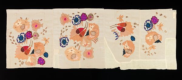 This object is from a collection of sample embroideries, which was originally owned by Morris de Camp Crawford, editor of Women's Wear Daily, who collected objects which told the story of fashion and fabric history. Included in this collection was a group of textiles which illustrated what American and French designers and manufacturers were using. According to Crawford's book The Ways of Fashion, the work of Polish artist Sarah Lipska (1882-1973) was represented in this collection. Lipska is an enigmatic figure, who is known to have worked with Leon Bakst as a set and costume designer for the Ballets Russes, and later in the 1920s as a fashion designer in Paris at 4 rue Belloni, and finally as a sculptor. Extant examples of her work are rare. Although only a few pieces in the Brooklyn Museum collection bear a label or a signature, others bear hallmarks of her work, such as a distinctive form of whip stitching on appliqué work, unusual abstract motifs, and Cubist-inspired patterns.