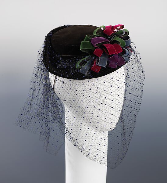 French milliers have long been regarded for their high standards in the design and trimming of women's hats. A hat like this example, from a prominent Parisian designer of the 1930s, would have been a prized commodity for American women. The skillfully applied jewel-tone ribbons and the refined quality of the delicate veiling are indicative of the materials and techniques used in French millinery ateliers such as Madame Suzy's. However, the late 1930s marked a turning point for the industry. War interupted fashion production in Paris the year after this hat was made and allowed for American designers to gain recognition in the 1940s.