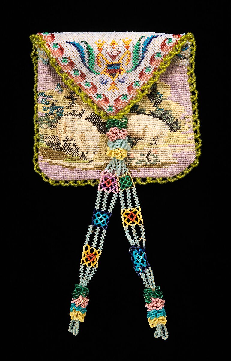 The construction of this bag combines beadwork and needlework. The needlepoint lamb motif recurs frequently in beaded bags. The lining, an 18th-century dress silk, possibly French, is an example of the reuse of precious dress silks from earlier periods. The crown motif may have some ceremonial significance, possibly related to marriage. The purse is part of the Mexican beadwork collection of over 600 pieces assembled by Elizabeth Morrow (1873-1955), mother of writer Anne Morrow Lindbergh, the wife of renowned aviator Charles Lindbergh. Morrow collected the objects between 1927 and 1930, when her husband, Dwight Morrow, Sr., served as U.S. ambassador to Mexico. She lent the collection to the Brooklyn Museum in 1938 and upon her death, her children donated it. A collection of 155 pieces of Mexican ceramics and other decorative arts were given to Amherst College, her husband's alma mater.