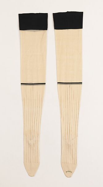 Produced by the McCallum Hosiery company of North Hampton, Massachusetts, this pair of stockings has a seductive appeal as well as a sporty look, created by the sheen ribbing at the lower half of the leg and the horizontal bands at the knee.