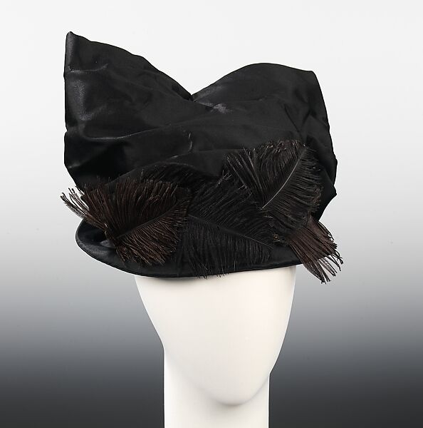 As society emerged from the conservatism and strictures of conventional 19th c. values, clothing designers embraced the increasing spirit of freedom and modernity by experimenting with shape and silhouette. Millinery is an area of design that lends itself particularly to unfettered creativity, as the functional demands are minimal compared to other garments. The distinctive form of this hat, resembling two large ears, was high style during the period. In essence, the entire crown is treated as a bow, indicating a fundamental rethinking about the relationship between ornament and structure. Testifying to the sophistication of the trade, the masterful drapery shows facility with manipulating the fabric, and the clipped ostrich feathers echo the soft points of the crown.