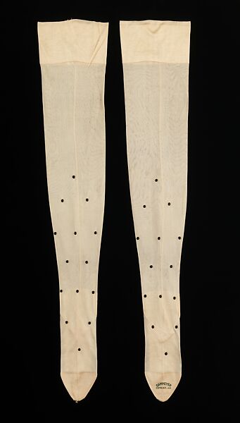 This pair of stockings is an excellent example of how the patterning of the stocking was higher on the leg in the twentieth century, indicating the possibility of more leg being seen. The toe is stamped A.J. Cammeyer, a Fifth Avenue retailer specializing in the sale of shoes and corresponding accessories.