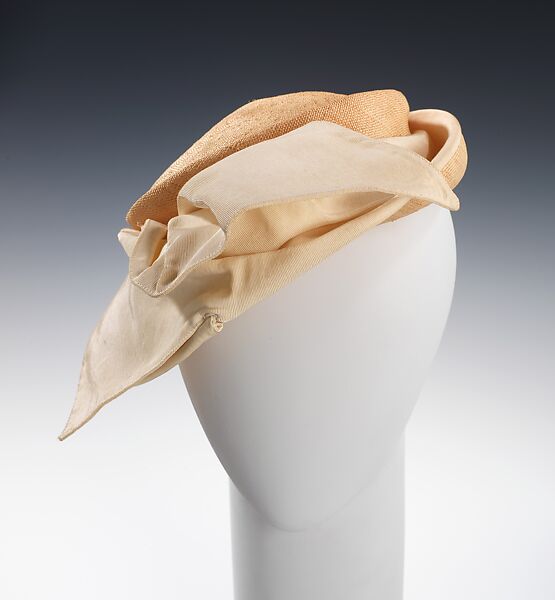 No particular shape dominated in women's headwear in the late 1930s, and asymmetrical styles meant few hats could be easily described. The complex brim treatment of this hat by Sally Milgrim conveys a strong sense of integrative design. Both materials, straw and ribbon, have been pleated and contorted, uniting the hat body and the trimming into a refined whole. Milgrim's pairing of two cream materials allows the texture of each to contrast with the other and prevents any colorful distraction from her sophisticated design.