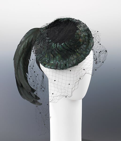 The fashion for "Eugénie" hats exploded in popularity following the release of Romance, a 1930 film starring Greta Garbo (1905-1990) costumed by Gilbert Adrian. Set in the mid-19th century, the same era in which Empress Eugénie (1826-1920) reigned over the French court and influenced fashion throughout Europe, the film featured a hat that particularly appealed to movie audiences ready for a departure from the cloche style of the late 1920s. Worn at an angle to display the wearer's ears and hair, the small hat trimmed with feathers and, in this example, a veil as well, epitomized coquetry. The popularity of the style represented the power of film to affect the American millinery industry.
