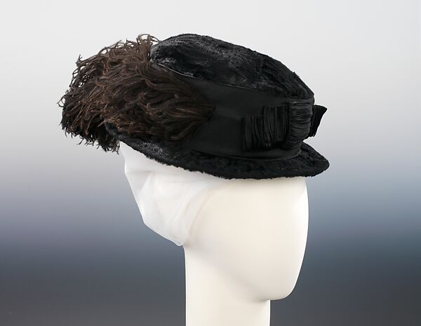 A combination of interesting textures and attractive lines makes this well-preserved hat a highlight of the collection. The crushed hatters plush gives the appearance of broadtail fur, and the tailored bow in front is created from strips of silk, which adds another texture to hat. The low, elongated shape and thoughtful application of feathers creates an aerodynamic feel, which was an important trend of the period.