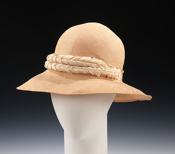 While little is known about the milliner Eugénie Safontas, the quality of the hats given to the Brooklyn Museum collection by Mrs. Frederick H. Prince, Jr. bearing the label of her shop in Biarritz indicates she adhered to the highest standards of craftsmanship. In this example from the late 1920s, she has created a women's summer hat cleverly uniting the woman's cloche style with the man's panama style in vogue at the time. Made of fine balibuntal straw like a man's panama hat, it also bears the characteristic crown ridge of the man's style. Instead of the traditional smooth grosgrain hatband however, the milliner has worked the silk ribbon to create a tailored leaf-like garland, bringing a feminine touch to this stylish hybrid.