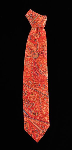 Liberty & Co. founded in London in 1875 by Arthur Lasenby Liberty (1843-1917) as a retailer specializing in goods from the Orient and Far East, became strongly influenced by the Aesthetic Movement, and later, was associated with the Art Nouveau style. The retailer, an advocate of affordable and distinctive design, not only imported items, but also tapped English designers of the day to produce furniture, household goods, and fine textiles. A purveyor of men's as well as women's clothing and accessories throughout the 20th century, Liberty created neckties as distinctive as their textile patterns. A classic Liberty product, the tie's swirling bright red paisley pattern is an example of the enduring popularity of the designs and colors of Indian cashmere shawls and speaks to Liberty's origins as an importer of non-Western goods.