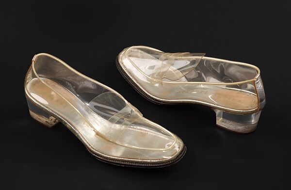 The clear vinyl upper was one of Beth Levine's signature styles, and one which was copied by numerous other designers. This loafer design is very unusual for the transparent idiom, as it was most commonly seen in a pump style. Levine patented a method for attaching clear acrylic heels without the use of screws, greatly improving their virtual transparency.