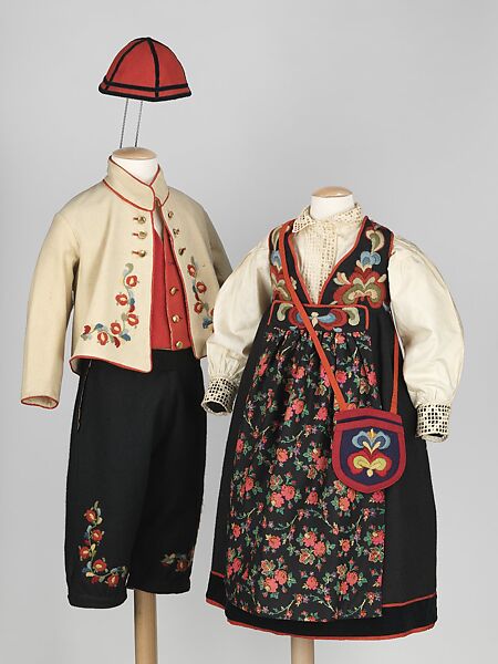 Scandinavian clothing bears striking similarities amongst the countries with very few distinctions. This boy's ensemble, pictures here with a complete girl's ensemble is distinctive to Norway for its darker color palette than neighboring Sweden and Denmark.