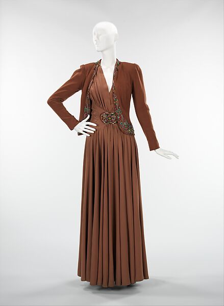 The strong visual appeal of this evening ensemble comes from the stunning contrast of colored stones against a brown ground. Emblematic of evening ensemble from the period, it displays high-quality workmanship, especially in the elegant gathering on the skirt front. Jay Thorpe was an important women's specialty retailer, offering both imports as well as custom-made goods.