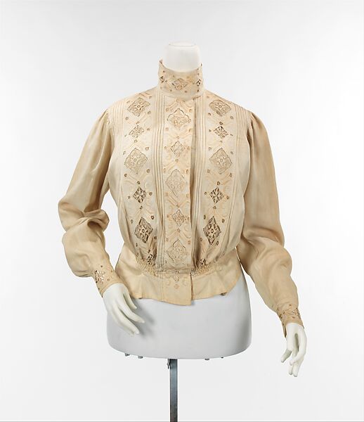 This blouse reflects the classic shape found during the early 20th century. A fine quality garment, it includes such details as handmade needle lace inserts and button and loop closures.