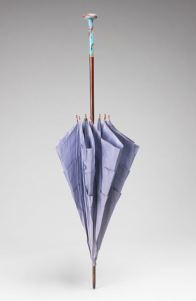 This is an interesting and elegant parasol, purchased on the rue Royale, the main shopping thoroughfare in Paris particularly attractive to tourists. The handle imitates the Chinese cloisonné technique with distinctly Chinese imagery, and fits accordingly with the craze for Orientalism during that period.