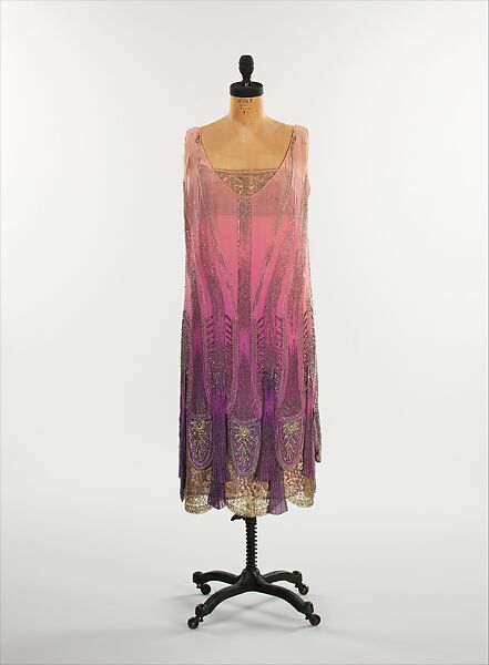 The 1920s was the era of the flapper - a liberated woman who danced all night, sipped cocktails and frequently smoked. She was a carefree spirit and this was expressed through her dress. Hemlines rose and waistlines dropped, creating a tubular silhouette. Sheer and delicate fabrics were used, revealing more skin, and heavy beading was a common adornment, for the beads would catch the light and sparkle while the wearer was in motion. For a fabulous night on the town, a lady had to have the appropriate wardrobe and this evening dress is a perfect example of a well-made dress of the period. It is a visually appealing piece with the combination of the ombré fabric and the refined beadwork. The floating panels on the skirt are a classic design element of the 1920s dresses and would have been quite eye-catching while the wearer danced the Charleston and the Black Bottom.