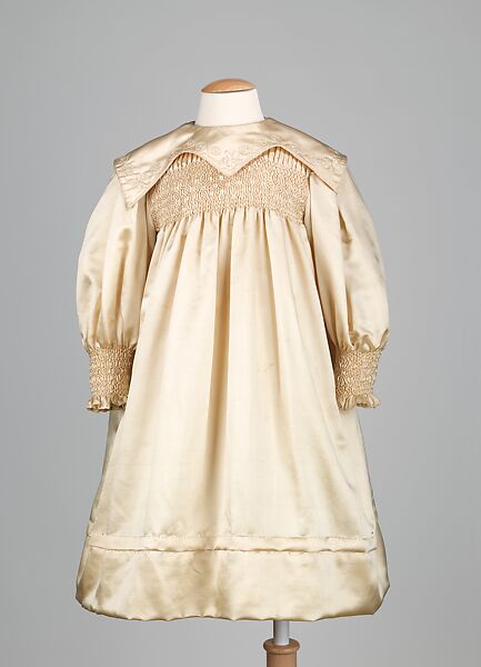 This beautifully made child's garment has the aesthetic of Liberty & Co. garments from this period. While there is no clear documentation that this is so, it bears all of the Liberty hallmarks: the supple satin, smocking, stylish shape of the collar and self-colored embroidery.