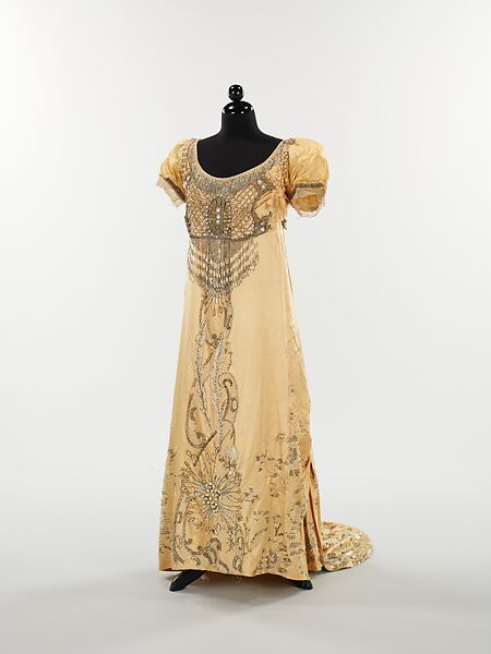 Drecoll was a major Parisian house during the early 20th century. This dress reflects an interest in historicism; the empire style and embroidery evoke the neoclassical fashions of the Napoleonic era.