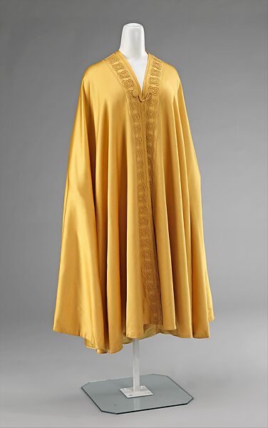 Produced in one of Liberty's trademark high-quality silks, the rich yellow satin of this cape is draped in the fashion of Middle Eastern outerwear. Its elegant simplicity is relieved by the distinctive curvilinear pattern of overlapping silk cord that sinuously loops around itself. It is a good early 20th-century example of the Art Nouveau design that was synonymous with Liberty & Co.