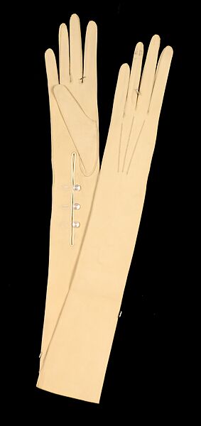 This pair of gloves is part of a gift of unworn fine French gloves. Each pair provides an interesting visual document of the many lengths that gloves were produced in. This is the third length, from short to long, of eight lengths represented of the 86 from this donor, which range from 4" to 26" measured from the bottom of the thumb to hem. They were all made in France of the finest materials and craftsmanship. The intricate overstitching and gussets between the fingers are characteristic of fine workmanship.