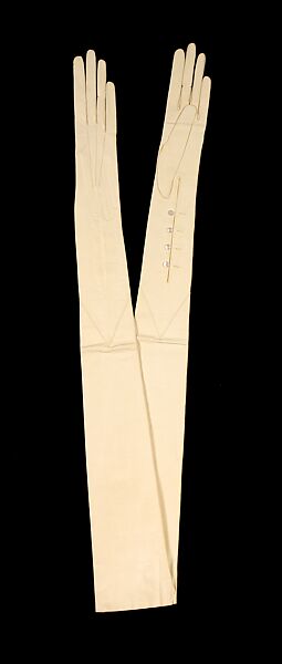This pair of gloves is part of a gift of unworn fine French gloves that provide an interesting visual document of the many lengths that gloves were produced in. This is the sixth length, from short to long, of eight lengths represented of the 86 from this donor, which range from 4" to 26" measured from the bottom of the thumb to hem. They were all made in France of the finest materials and craftsmanship. The intricate overstitching and gussets between the fingers are characteristic of fine workmanship.