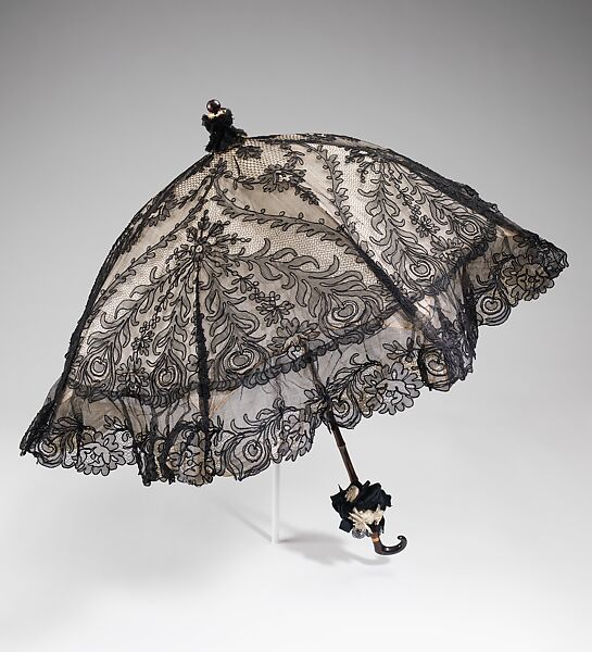 Featured, is an example of a fine French parasol created by Dupuy whose establishment was in the most prestigious shopping area in Paris during the Belle Époque period. The rue de la Paix was home to many fine establishments, offering the highest luxury goods. This parasol echoes the construction of the dresses at the time which involved many layers of different types of filmy materials and exuberant ruffles.