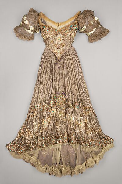 This evening dress is an example of extraordinary surface decoration and craftsmanship that was used during the Belle Époque by the great Parisian couturiers. The mixture of lamé and ten various metallic materials represents the pinnacle of this kind of work. While the dress is in poor condition, it is easy to envision a lady of society making a stunning entrance to one of the many fashionable events of the time.