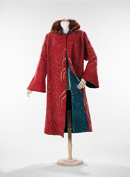 The 1920s was a fashionable period, introducing a new silhouette. Long skirts, frills and tiers of lace were exchanged for a tubular silhouette, short skirts, and diaphanous fabrics decorated with heavy beading. With such sheer and revealing dresses, coats were much in vogue. The evening coat featured here is an excellent example of the different styles that were available and that were deemed stylish. This interpretation of a Chinese robe worked in quilting is quite stunning and shows how non-Western design influenced fashion.