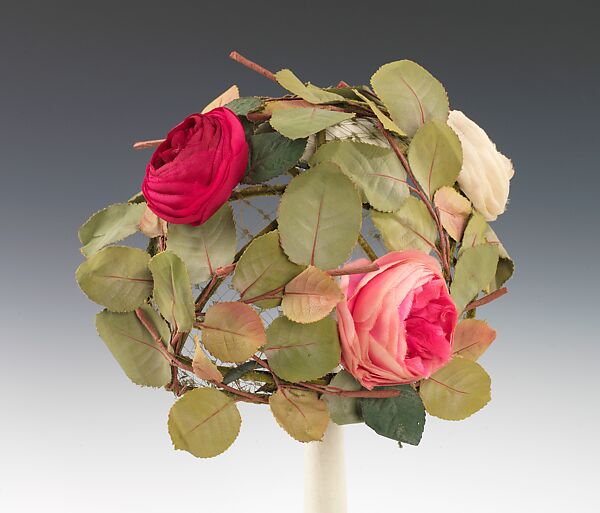 The silk roses and leaves that make up the structure of this hat are exquisitely made. Flowers have long been a mainstay of hat decoration, culminating in the late 1950s and early 1960s when the entire surface was often covered in artificial flowers.