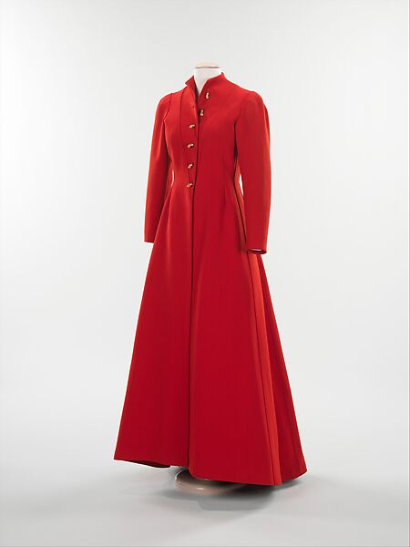 In Schiaparelli's winter 1935-36 collection, military influences abounded, inspired by the uncertain political climate in Europe. Other couturiers featured red coats in their winter collections for that year, but Schiaparelli’s subtle nontraditional expression of a traditional shape--the military greatcoat--resonates. Schiaparelli's particular sculptural sensibility is seen in the rigid silhouette and the exposed seams are a side effect of her artistic attention to detail and thoughtful design sense. As she did throughout her career, Schiaparelli worked with artists to execute her whimsical designs for fasteners such as buttons. The cast metal organic swirling buttons on this coat are by the artist Jean Cocteau. Schiaparelli and Cocteau collaborated many times, but to see his work in such a small detail is indicative of their close working relationship. The brilliant red wool used is an example of her desire to realize her designs with custom fabrics by well-known mills. In this case, the textile, called "rouge gaulois," or Gallic red, is made by Ducharne, a firm well-known for their modern silk designs. It is interesting to see that Schiaparelli requested a woolen from Ducharne, and shows that she was constantly seeking to create something new.