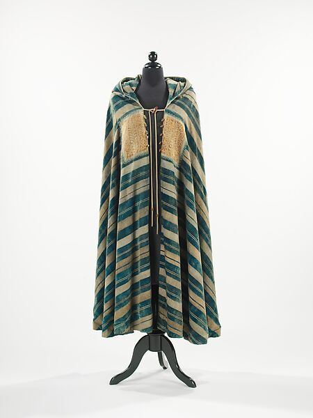Fortuny's burnoose was based on the traditional Arab garment; its loose shape and exotic roots well-suited to Fortuny's unique dress designs and avant garde clientele. Teal velvet, an unusual color for this popular style, is heavily stencilled with gold stripes and the scroll and foliate forms on the tan velvet suggest Persian influences.