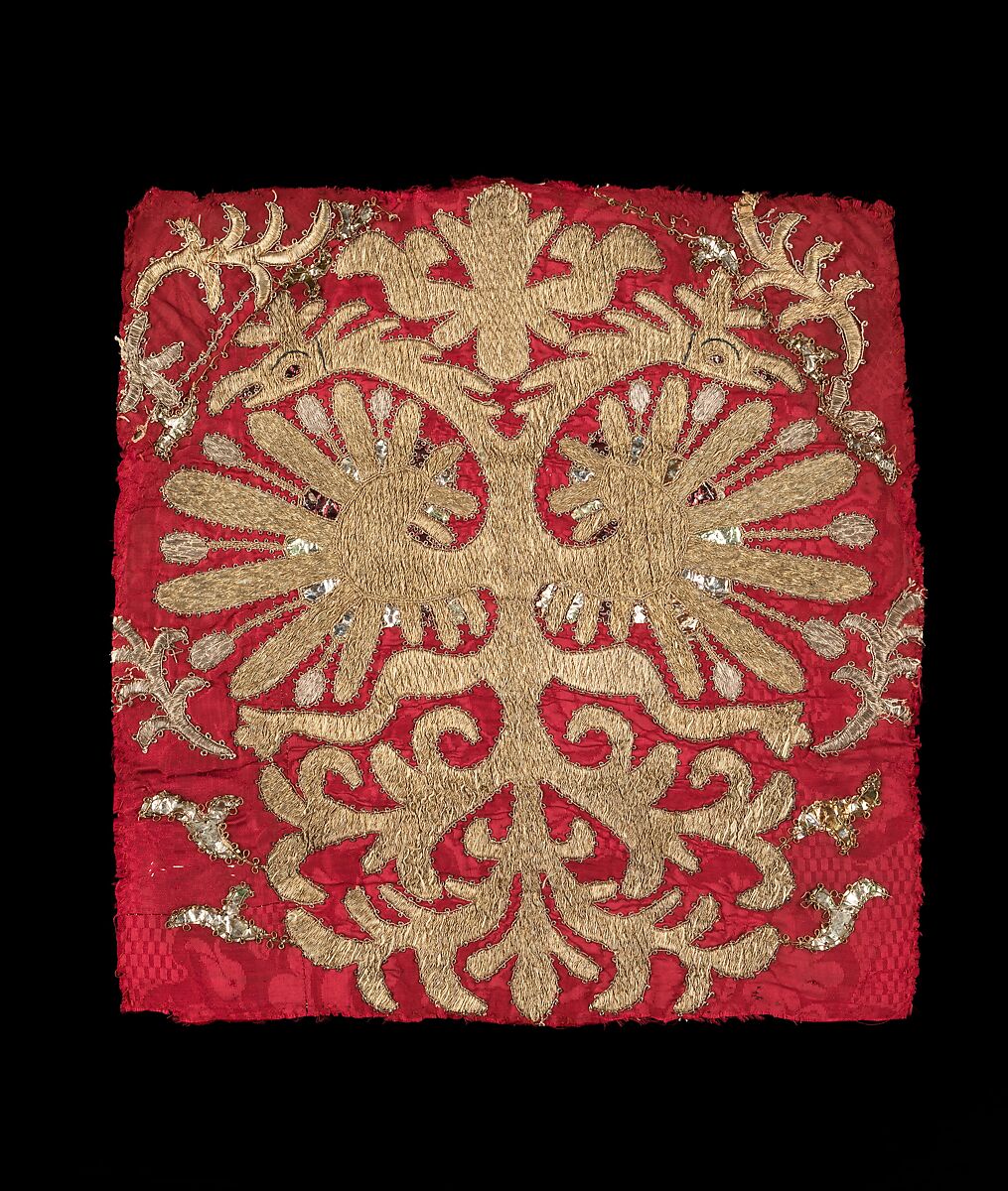 The double-headed imperial eagle is a common motif, symbolizing Russian sovereignty. In this particularly exuberant rendition, the eagles strain toward the fabric edges, while the feathers have added definition in alternating forms and foil accents.