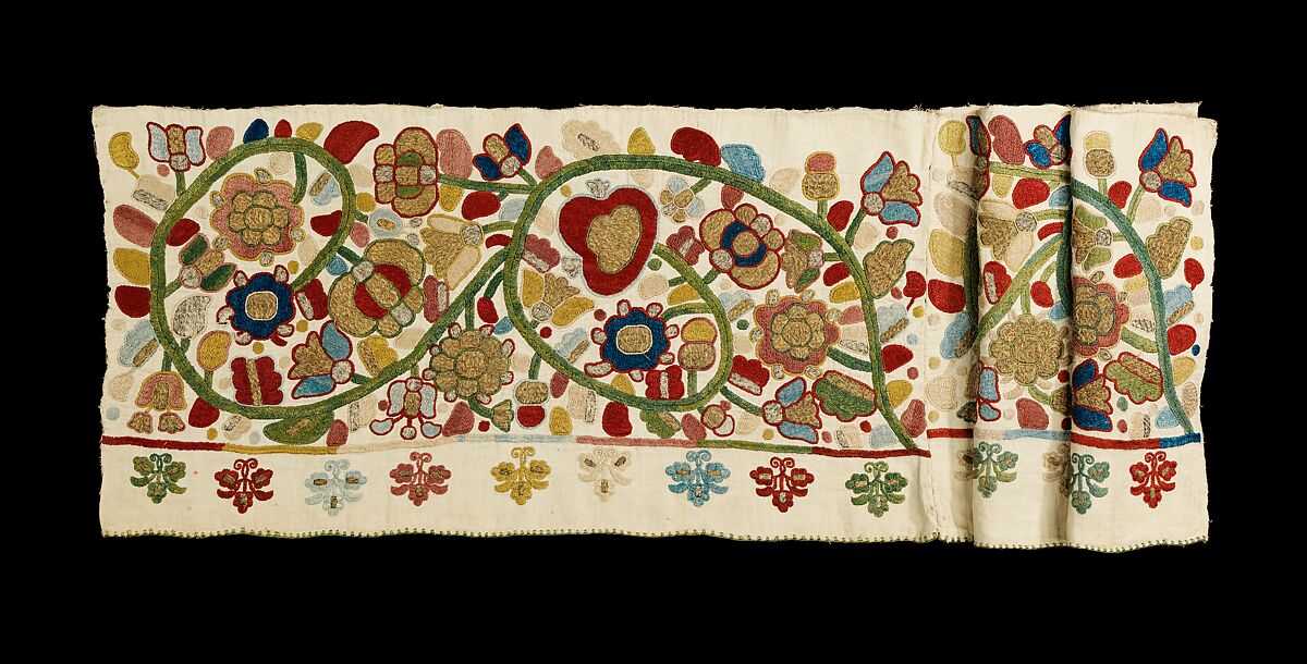 This object is from the collection of Natalia de Shabelsky (1841-1905), a Russian noblewoman compelled to preserve what she perceived as the vanishing folk art traditions of her native country. Traveling extensively throughout Great Russia, she collected many fine examples of textile art of the wealthy peasant class. From the 1870s until moving to France in 1902, Shabelsky amassed a large collection of intricately embroidered hand-woven household textiles and opulent festival garments with rich decoration and elaborate motifs. The Brooklyn Museum holdings include many fine examples including the majority of the garments. Portions of Shabelsky's collection are also housed at the Museum of Fine Arts, Boston, the Cleveland Art Museum, and the Russian Museum of Ethnography in St. Petersburg.