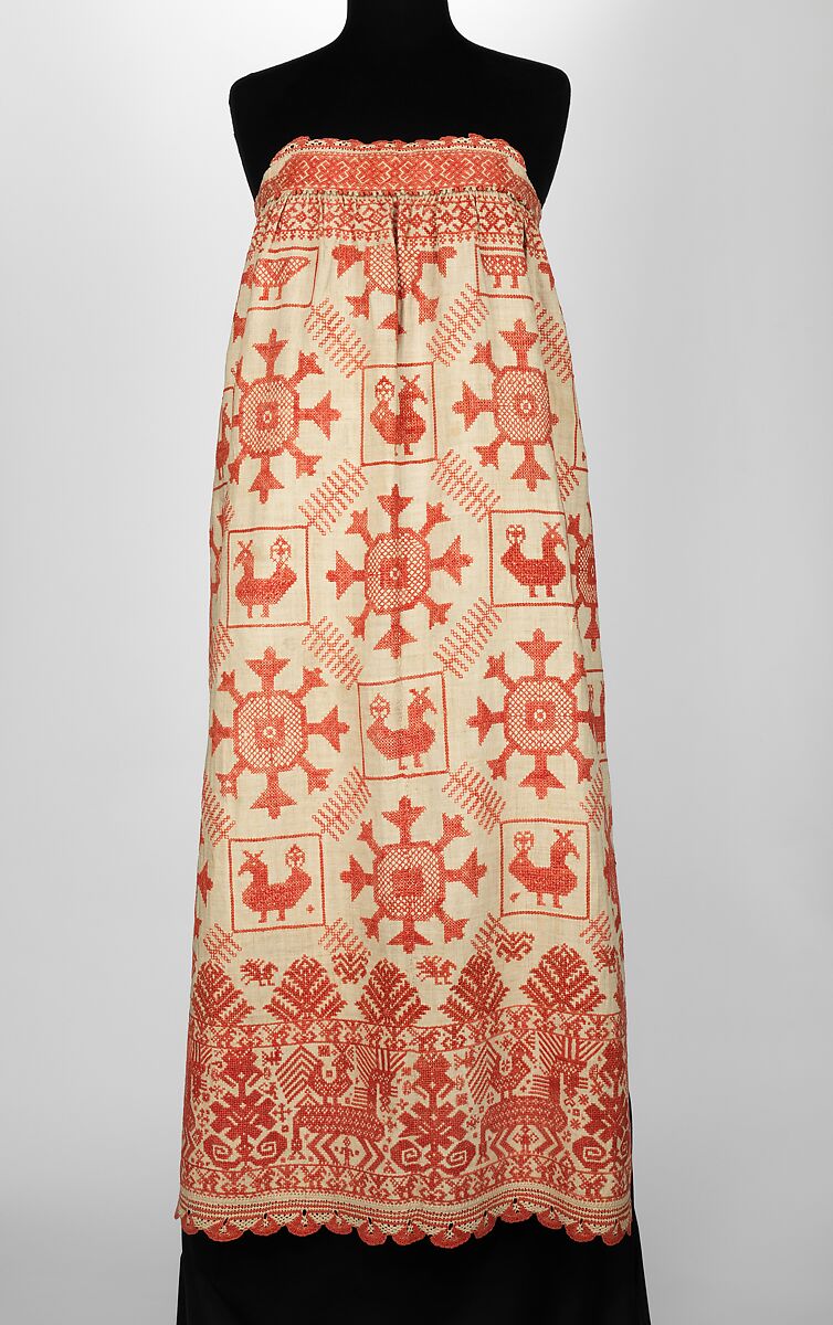 This object is from the collection of Natalia de Shabelsky (1841-1905), a Russian noblewoman compelled to preserve what she perceived as the vanishing folk art traditions of her native country. Traveling extensively throughout Great Russia, she collected many fine examples of textile art of the wealthy peasant class. From the 1870s until moving to France in 1902, Shabelsky amassed a large collection of intricately embroidered hand-woven household textiles and opulent festival garments with rich decoration and elaborate motifs. The Brooklyn Museum holdings include many fine examples including the majority of the garments. Portions of Shabelsky's collection are also housed at the Museum of Fine Arts, Boston, the Cleveland Art Museum, and the Russian Museum of Ethnography in St. Petersburg.
