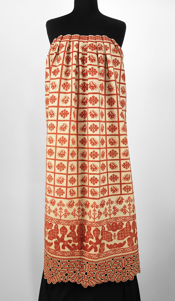 This object is from the collection of Natalia de Shabelsky (1841-1905), a Russian noblewoman compelled to preserve what she perceived as the vanishing folk art traditions of her native country. Traveling extensively throughout Great Russia, she collected many fine examples of textile art of the wealthy peasant class. From the 1870s until moving to France in 1902, Shabelsky amassed a large collection of intricately embroidered hand-woven household textiles and opulent festival garments with rich decoration and elaborate motifs. The Brooklyn Museum holdings include many fine examples including the majority of the garments. Portions of Shabelsky's collection are also housed at the Museum of Fine Arts, Boston, the Cleveland Art Museum, and the Russian Museum of Ethnography in St. Petersburg.