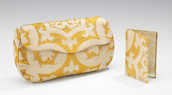 Despite the economic conditions in America during the early 1930s, stylish accessories like this clutch bag were a must for the well-heeled woman. Here the scrolling pattern of the luxurious brocade textile suits the curves of the bag flap, and the inclusion of a matching bill and mirror case is an additional refined touch. The mark on the interior of the bag indicates that it was made with a textile from the Armand Hammer collection. A traveling exhibition and sale of Russian imperial artworks and artifacts amassed by the Hammer family toured the United States in 1933-1934. Items from the show were sold at high-end department stores, including Lord & Taylor in New York City where this bag may have been purchased.