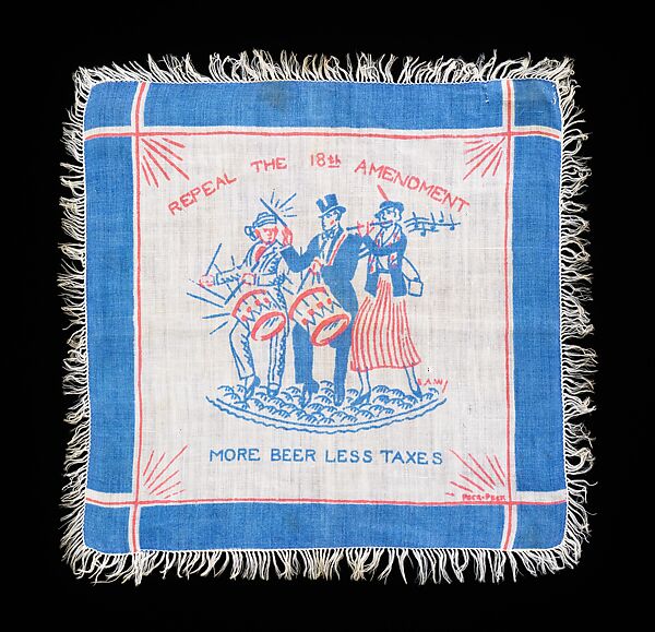 Textiles were often used in the 1920s and 1930s for propaganda purposes. This souvenir handkerchief is makes a case for the growing sentiment toward repealing Prohibition, which was in effect from 1920 to 1933. The design is meant to evoke imagery from the 1875 painting, "Spirit of 76," the famous Revolutionary War-themed work by Archibald MacNeal Willard (1836-1918). Unlike the Willard painting, here a female figure is included and the protagonists march on beer foam instead of on solid ground. The Peck and Peck signature is evidence that a well-established department store carried goods that pertained to a political issue.