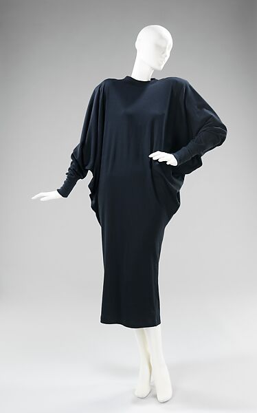 This day dress is one of the most significant Norma Kamali designs made using sweatshirt fabric. The appropriation of athletic material is reminiscent of Chanel's use of underwear knits in her early designs. The shape of the garment is evocative of the cocoon coats of the 1910s.