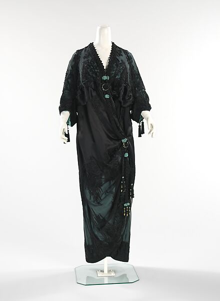 The contrast of black chiffon over aqua satin contributes to this evening coat's visual appeal. The use of tassels and braid trim reflect an Asian influence and the ongoing interest in Orientalism at the time. The coat originally belonged to the donor's mother, Mrs. Francis Neilson (née Helen Swift), daughter of Gustavus Swift, the founder of the Chicago meatpacking Swift & Company.