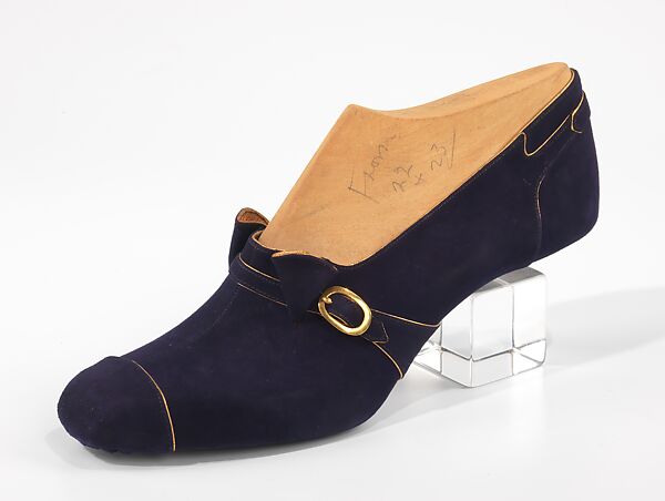 Superbly refined detail and appealing color and material contrasts distinguish this prototype. The design is annotated as a development of the two previous models: on 2009.300.3059 the vamp has simply been pleated strapped in place; on 2009.300.3060 the pleating has been formalized and stitched in place; here the pleats are further refined into two neat tucks formed by a belt across the throat.